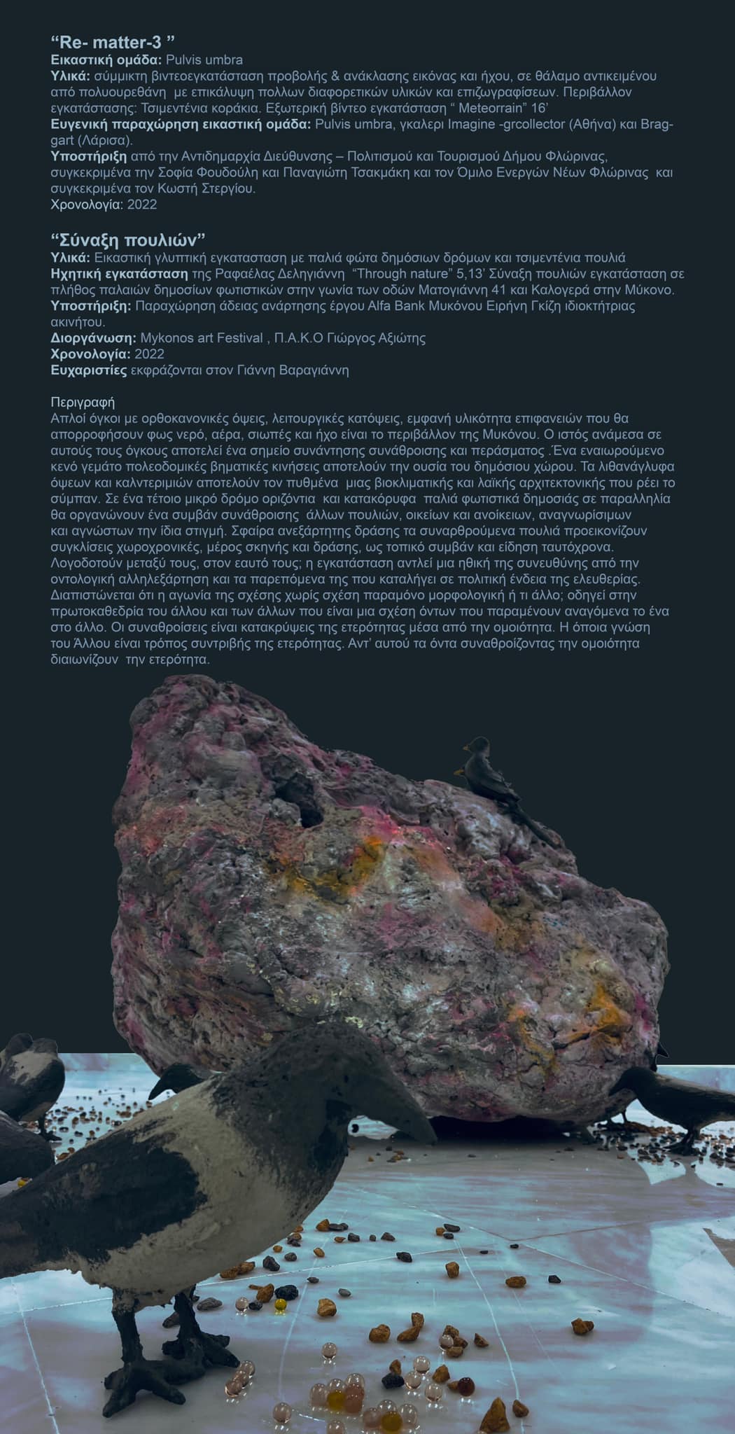 DIPOLA, faithful to its original goal of detecting creative forces, opens up to new artistic proposals and confrontations of works from different directions by new creators together with the professor of the school of fine arts of the University of Western Macedonia (based in Florina), Haris Kontosfyris, and the art group Pulvis Umbra , each giving their artistic position to the Municipal Art Gallery of Piraeus